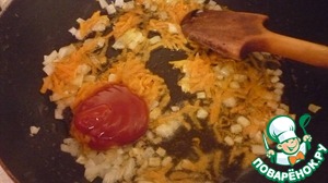 Добавляем томатную пасту, можно заменить ее кетчупом. Приправляем перцем и сушеным базиликом, обжариваем.