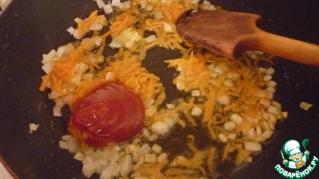 Готовим заправку. Поджариваем на небольшом количестве растительного масла обжариваем лук до золотистого цвета, затем добавляем морковь, обжариваем.