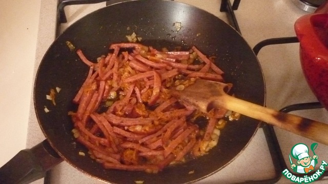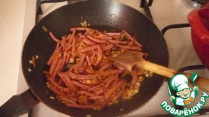Добавляем нарезанную тонкой соломкой копченую колбаску. Жрим до румяной корочки, но не пережариваем.