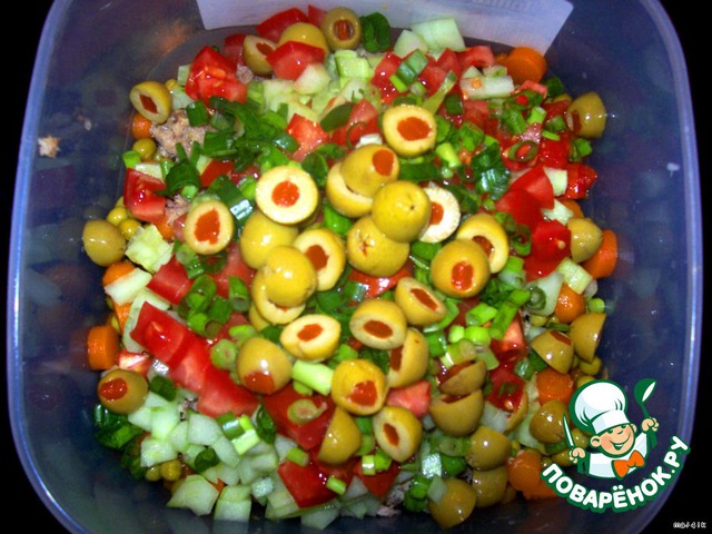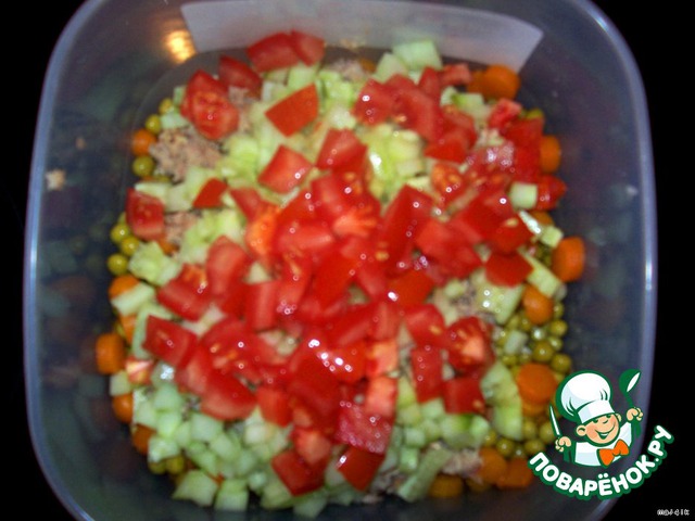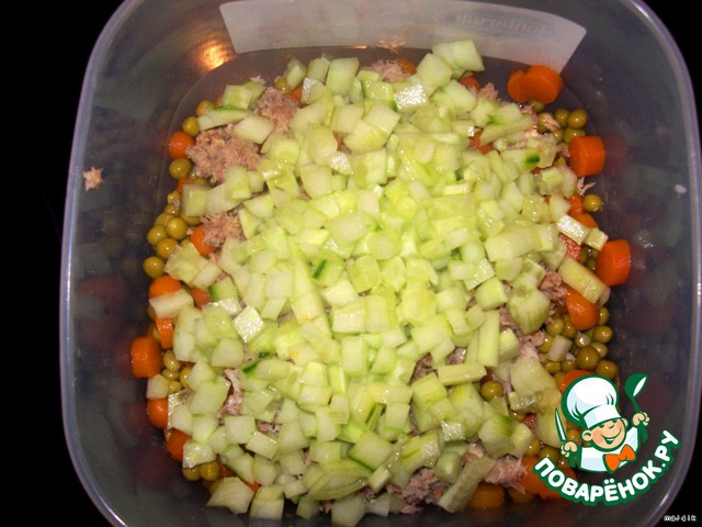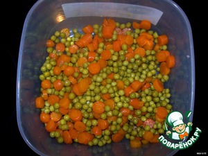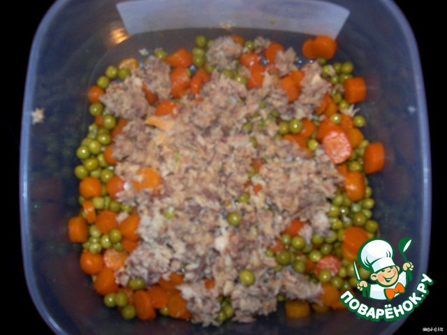 С сардин слить масло, размять вилкой, добавить к морковке и горошку.