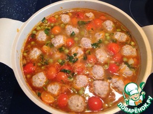 Добавляем зеленый горошек (можно с консервированным рассолом, кому как нравится), помидорчики черри (предварительно порезав на 4 части) и мелко порубленную кинзу, варим 5 мин.