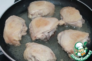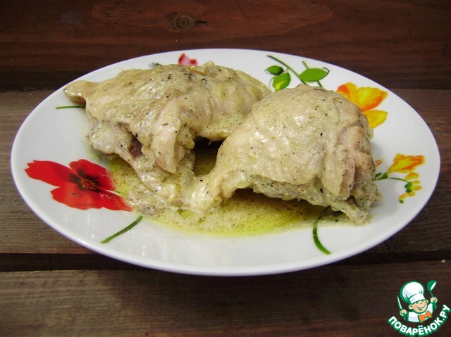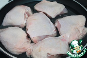 Курицу моем, обсушиваем. Кладем на смазанную растительным маслом сковороду, добавляем подсоленной воды, чтобы скрывало половину курицы, накрываем крышкой и на медленном огне тушим до готовности. Примерно 25 - 30 минут. Иногда переворачиваем.