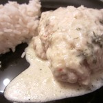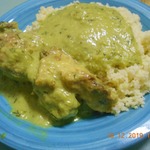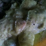 В наше пюре добавляем карри, перец чили молотый, сметану, зелень мелко нарезанную, бульон в котором тушилась курочка и немного солим. Все тщательно перемешиваем.