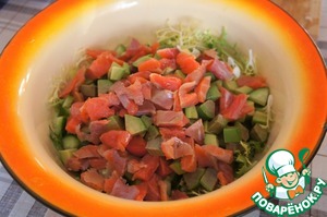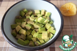 Авокадо очистить, удалить косточку. 1.5 штуки нарезать кубиками, полить лимонным соком и перемешать.