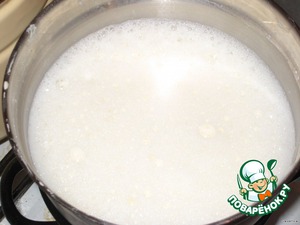 Молоко довести до горячего состояния и, постоянно взбивая желтки, тонкой струйкой влить горячее молоко. Поставить на водяную баню.