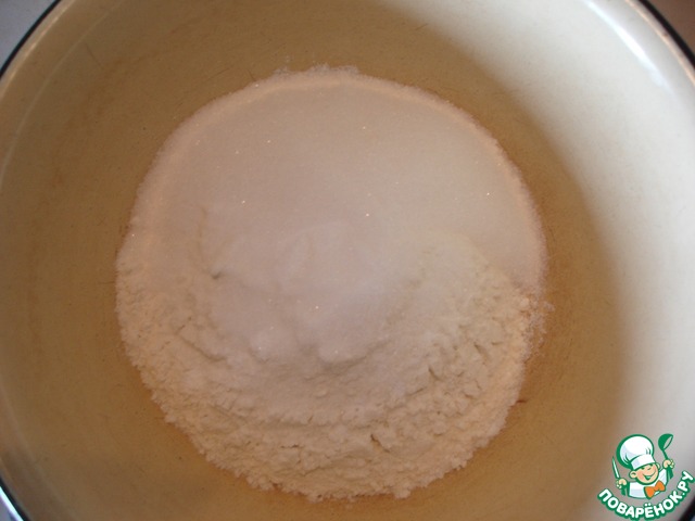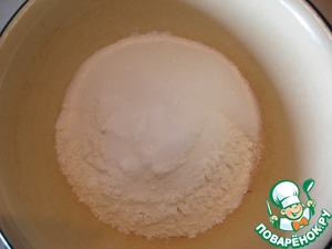 В миске смешиваем муку, 2 столовые ложки сахара и разрыхлитель