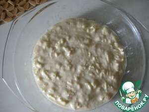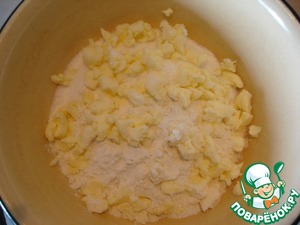 Выливаем смесь в муку с маслом и вилкой перемешиваем пока не останется сухой муки