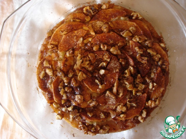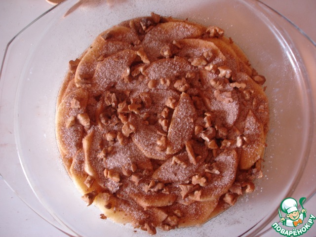 Ножом измельчаем орешки, смешиваем их с 1-2 ложками сахара и 1/4 ложки корицы и посыпаем сверху на яблоки. Духовку разогреваем примерно до 190 градусов и выпекаем 40 минут.
