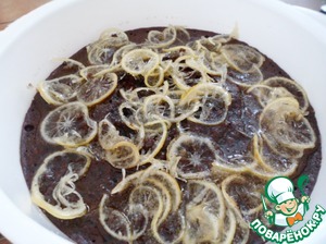 Вынимаем кейк из микроволновки и не жалея смазываем сладко-солеными лимончиками. Если конфитюр жидковат-ничего страшного-сироп впитается в тесто.