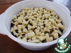 Сверху посыпаем натертым или нарезанным на мелкие кусочки сыром. У меня была моцарелла, но, думаю, лучше выйдет с голландским, швейцарским и тому подобными сырами, так как моцарелла слегка "резиноватая" для этого пирога.