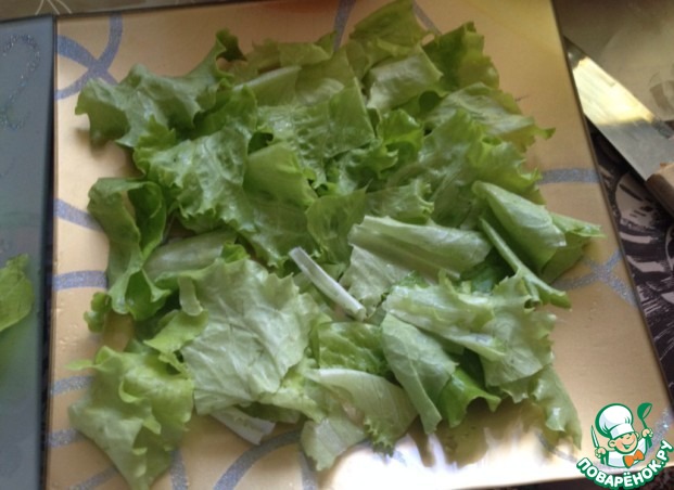 • Выкладываем листья салата на красивую тарелку. Красивая тарелка тоже очень важно. Красивая тарелка вообще важна в кулинарии! :)