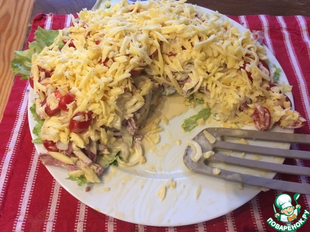 • Вуаля! Всё готово! Могу поспорить, что этот салат, ваши гости съедят намного быстрее чем традиционный оливье! Приятного аппетита друзья!