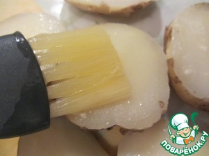 Когда картофель сварится, разрежем его вдоль пополам и смажем растопленным сливочным маслом.