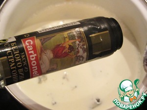 Заключительный этап - соус. Сливки доводим до кипения, добавляем раскрошенный сыр, снимаем с огня, добавляем уксус и тщательно перемешиваем.