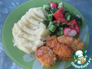 Добавить специи ( у меня была приправа для курицы) и соль по вкусу ( не забывайте что соевый соус соленый!). обвалять в панировочных сухарях ( я брала японские панировочные хлопья) и жарить до золотистой корочки с двух сторон.