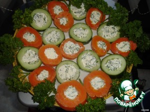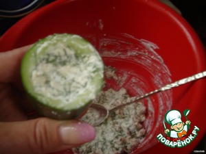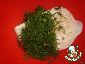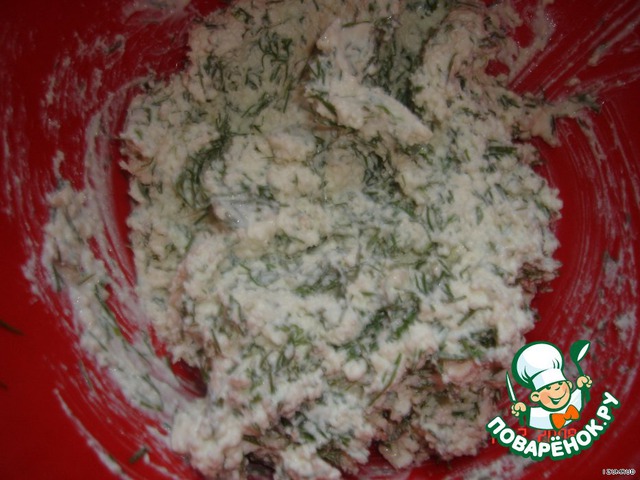 порезать мелко зелень укропа,выдавит чеснок и смешать с творогом добавив специи и сметану
