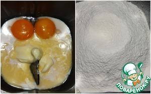 Вылить в ведерко х/п. Туда же добавить желтки, растопленное масло, соль, сахар и муку. Поставить на режим замеса теста.