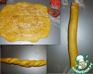 По готовности выложить тесто на припыленный мукой стол, раскатать в пласт, смазать мягким маслом и посыпать коричневым сахаром. Пласт свернуть в рулет и затем разрезать вдоль на 2 части. Каждую часть свернуть в жгут. Жгуты соединить между собой, сформировав тем самым калач.