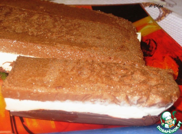 По желанию (если хотите получить элегантный десерт с богатством вкуса) через 20 минут после застывания в морозилке промажьте наш пломбир вареной сгущенкой, карамелью, джемом... На ваш выбор. Я промазывала карамельным соусом "Каджета" (мой рецепт здесь http://www.povarenok .ru/recipes/show/907 63/)