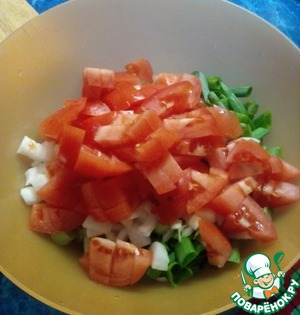 Режем помидоры и добавляем в лук.
