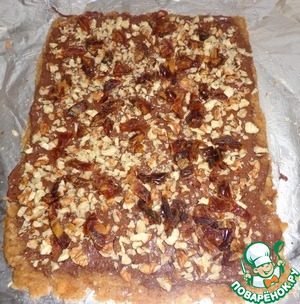 Сверху на шоколад кладем грецкие орехи и финики.