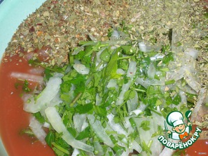 В томатное пюре выложить зелень с луком, специи. Хорошо перемешать. Я обычно соль не добавляю, но если вам нравится, посолите по вкусу.