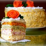 - Сыр плавленый (50г для прослойки с ветчиной, 50г для прослойки с морковкой, 100г для украшения торта) — 200 г