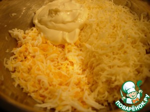 Сыр и яйцо трем на средней терке, мелко рубим чеснок, добавляем майонез, немного солим и перемешиваем. -