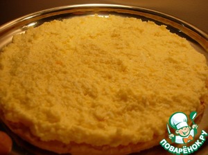 Выкладываем на четвертый корж и накрываем последним коржом. Тортик со всей тарелкой помещаем в полиэтиленовый мешок и слегка придавливаем. Отправляем в холодильник на пару часов. Для обмазки боков и верха торта смешиваем плавленый сыр с майонезом, обмазываем торт и оставляем в холодильнике не меньше, чем на сутки, чтоб торт хорошо пропитался.