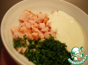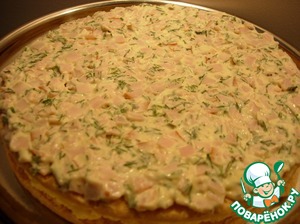 Мелко режем ветчину, укроп, добавляем черный перец, плавленый сыр, перемешиваем. Если хотите более пикантного вкуса, в эту массу рекомендую добавить немного мелко порубленного маринованного лука (маринад: 100мл воды, 1/2ч. л. соли, 1ч. л. сахара и 2ч. л. винного уксуса). Свежий лук лучше не использовать, так как торт долго настаивается.