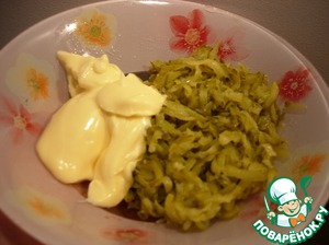 Трем на крупной терке огурчики, немного отжимаем и перемешиваем с майонезом.