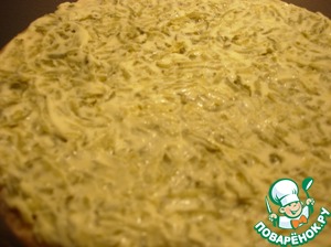 Выкладываем массу на первый корж, равномерно распределяем и накрываем вторым коржом.