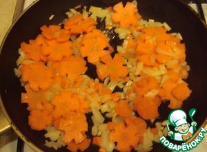 Режем мелко лук и морковку (можно фигурно, для пущей красоты), пассеруем на растительном масле, добавляем любимые специи.