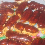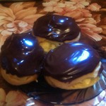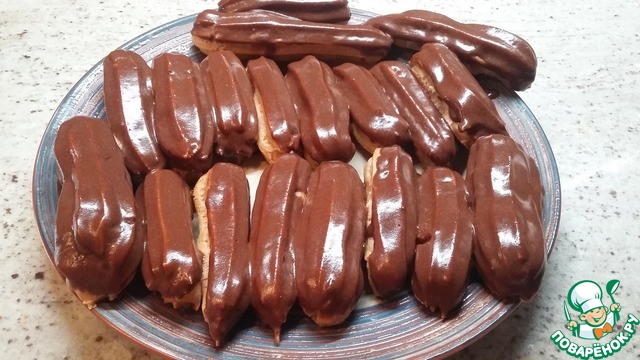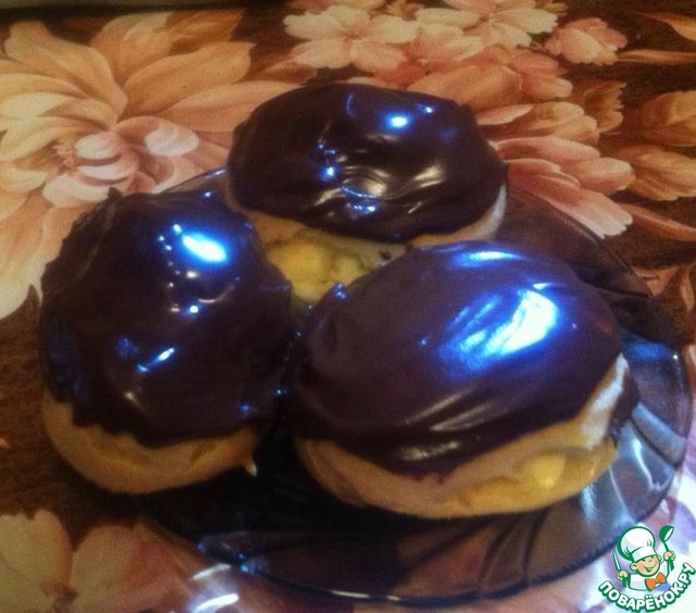 Готовые эклеры начиняем кремом с помощью кондитерского мешка или шприца. Сверху смазываем помадкой. Очень вкусно!
