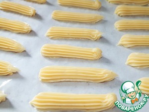 Противень застелить пекарской бумагой, промаслить и отсадить кондитерским мешком пироженки.