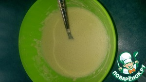 Включаем духовку на 200С и оставляем ее разогреваться. А тем временем делаем заливку для запеканки. Смешиваем до однородной консистенции яйца, молоко, муку, разрыхлитель и специи.