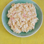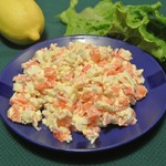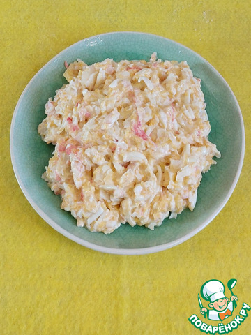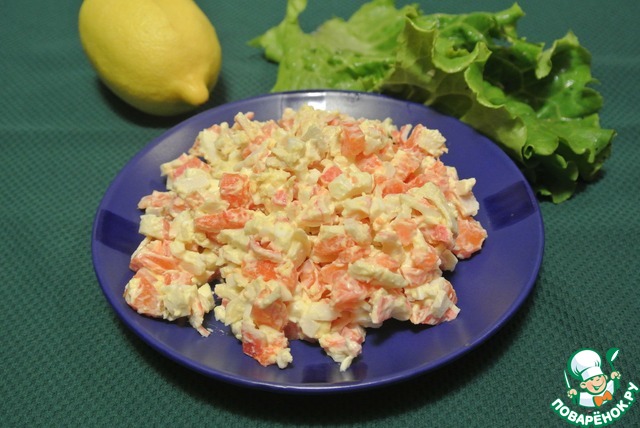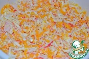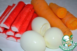 Трем на средней терке яйца, крабовые палочки и морковь. Можно чуть-чуть посолить. Заправляем майонезом. Все! Наш вкусный, нежный и сочный салатик готов!