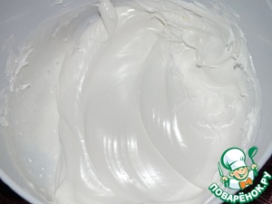 Делаем меренгу для верхушек. Яичные охлажденные белки взбиваем с сахаром (на паровой бане) - минут 10-15 до устойчивых пиков