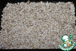 • В смазанную маслом форму для выпечки ровным слоем насыпать овсяные хлопья (или печенье).