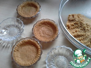 Раскладываем основу по формочкам и разминаем пальцами ровным слоем, формируя бортики. У меня под рукой не было силиконовых формочек, пришлось использовать стеклянные розетки, но из них потом неудобно было вынимать корзиночки, так что лучше использовать силиконовые. Ставим формочки с основой в холодильник на 30 мин.