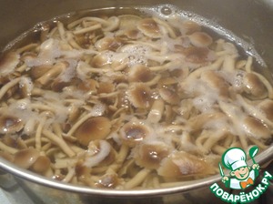 Грибы заливаем подсоленой водой (1 ст. л. на 2 литра воды). Доводим до кипения, варим 5 минут на среднем огне. Воду сливаем.
