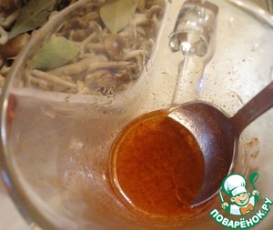 Готовим маринад. В исходном рецепте предлагались следующие пропроции на 1 кг грибов: воду - 3 ст. л., уксус - 2,5 ст. л., сахар - 2 ст. л., соль - 1 ч. л., давленый чеснок - 2 зубчика, красный острый перец - по-вкусу. Мне показалось, что такой маринад уничтожит полностью вкус самих грибов, поэтому изменила пропорции, оставив принцип приготовления. Я полностью убрала чеснок, добавила растительное масло и черный перец, увеличила количество воды и уменьшила количество уксуса, взяв при этом не обычный, а более деликатный яблочный уксус.