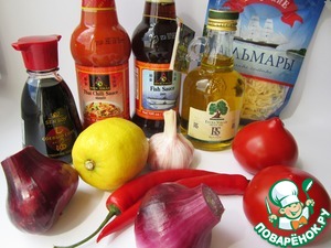 Ингредиенты, которые нам нужны для приготовления заправки: соевый соус, сладкий соус чили, рыбный соус, оливковое масло, сушеные солёные кальмары, лук, чеснок, томаты, перец чили, сок лимона.