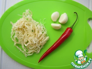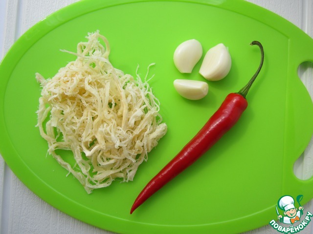 Измельчить 2 ст. л. сушеных солёных кальмаров, 3 зубчика чеснока и один перец чили.