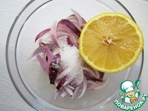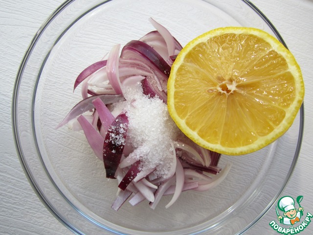 Две луковицы нарезать полукольцами и замариновать, добавив 2 ч. л. сахара и сок половины лимона. Оставить на 10 минут.