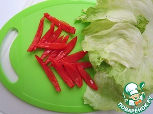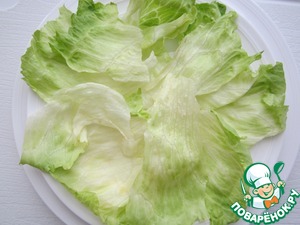 На сервировочной тарелке раскладываем листья салата айсберг.