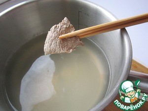 Вскипятить 1 литр воды. Не солить! Убрать огонь до минимума, чтобы вода в кастрюле еле-еле булькала. Опустить мясо в кипяток, поочерёдно, по одному кусочку, максимум на 1 минуту. Вытащить и остудить его под крышкой, чтобы мясо не обветрилось. Не стоит торопить события и бросать всё мясо сразу, иначе оно станет очень жёстким.