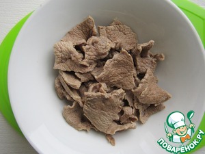 Вот так выглядит мясо после термической обработки. Предваряя ваши вопросы на предмет его готовности, сразу скажу: если вы нарежете мясо как можно тоньше, а вода в кастрюле будет близка к кипению, оно обязательно успеет приготовиться, даже не сомневайтесь. Если же, по каким-либо соображениям, вы не приемлете мясо в таком виде, тогда просто отварите его привычным для вас способом.