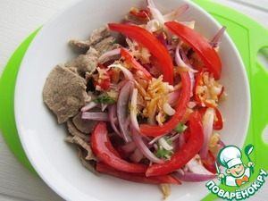 Сверху на листья салата выкладываем мясо, перемешанное с заправкой.