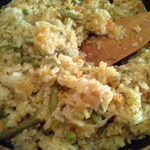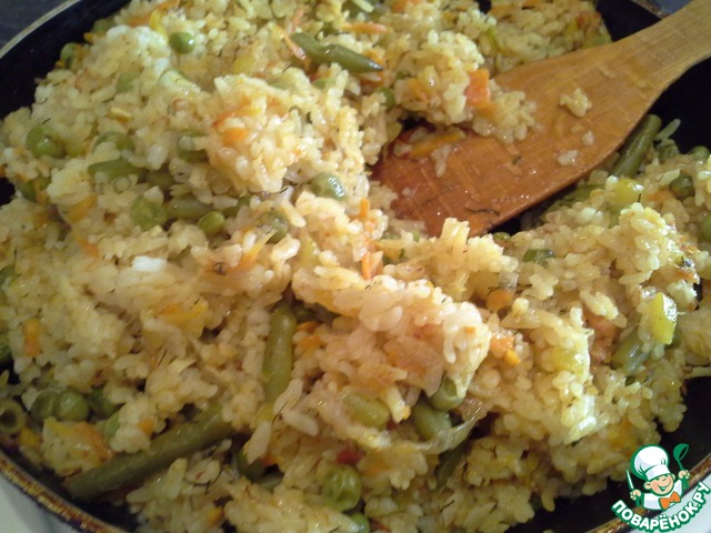 Одновременно отварите фасоль и горошек в кипящей воде минут 5. Слейте воду и добавьте к рису за 5 минут до окончания готовки.